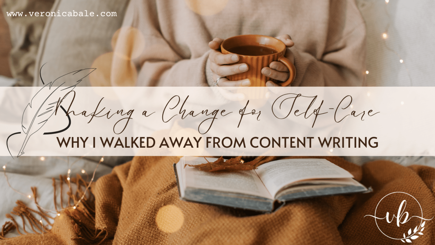 I also had to confront the fact that content writing takes up a lot of brain power. Even if I did have the time to put into writing content for other people and writing books for myself, I simply don’t have the mental energy. It’s carried me dangerously close to burnout, in fact, trying to do both. I realized that I had to sacrifice one for the other, and it was up to me which one I was willing to sacrifice. Because content writing needs to be done for other people (I’m a hopeless people pleaser, btw), and because there are looming deadlines, I’ve always just allowed content writing to be the thing that got my attention. Even though that is incredibly counterintuitive to what I want. Me, Veronica.